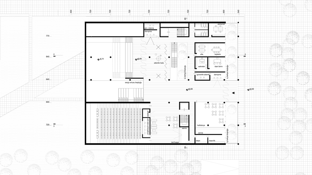 Bu doğrultuda kültür merkezi, büyük ölçüde topografyaya yerleşen, yer altına alınmış bir kütle olarak kurgulanmıştır.