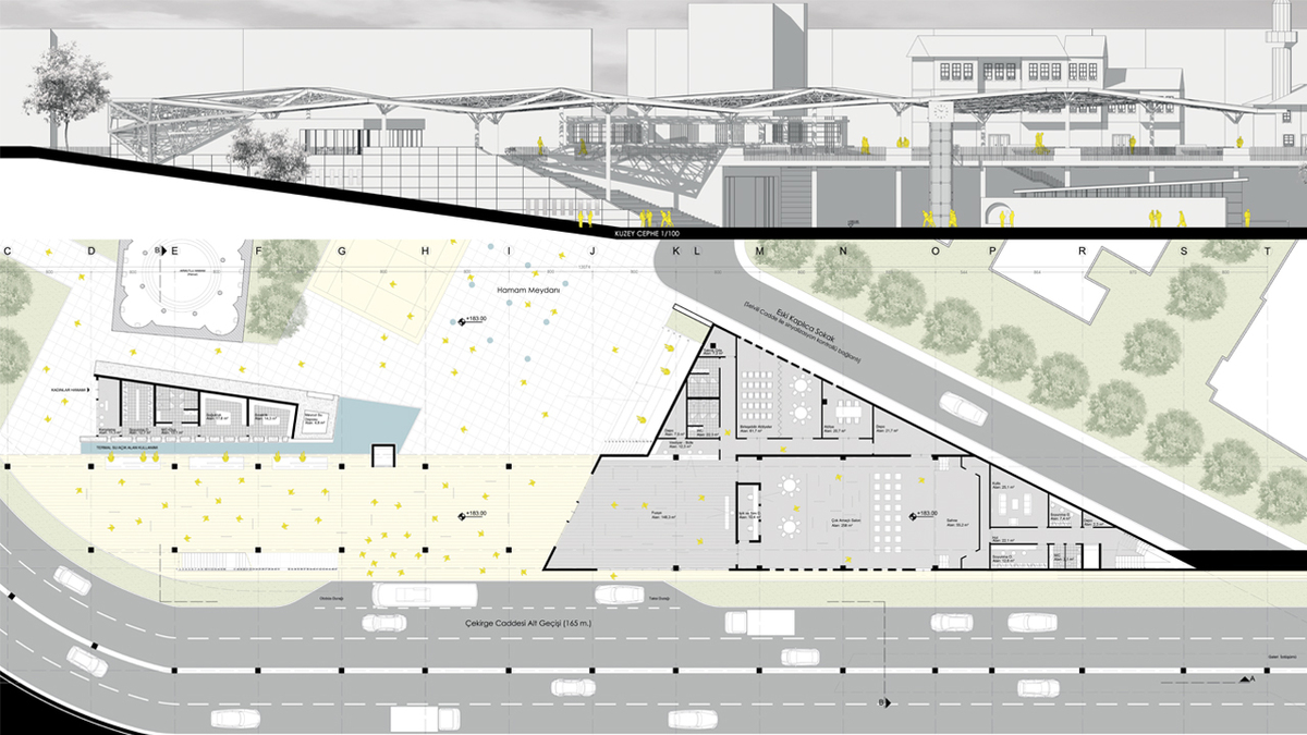 Üst örtü sistemi ve açık alan düzenlemeleri, meydan boyunca kesintisiz bir yaya akışı oluşturacak şekilde kurgulanmıştır.