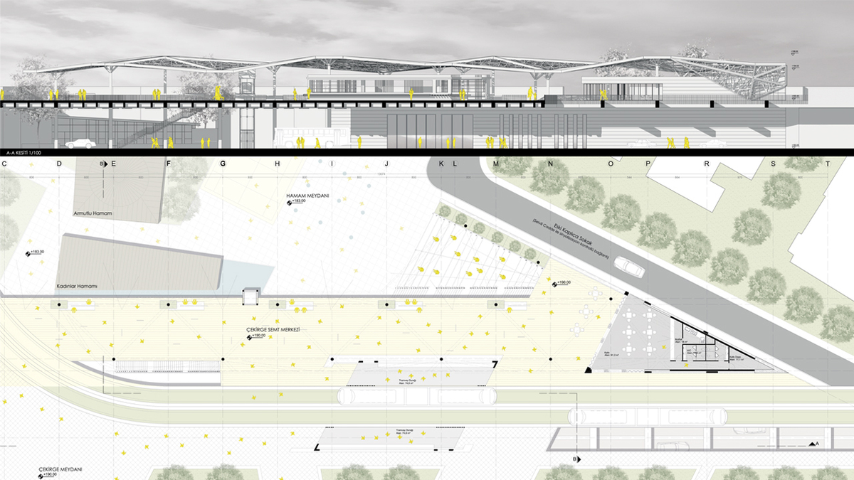 Arazinin doğal kot farklarından yararlanılarak geliştirilen bu çözüm, yüzeyde kesintisiz bir yaya hareketine olanak tanırken, meydanın kamusal niteliğini güçlendirmeyi hedefler.
