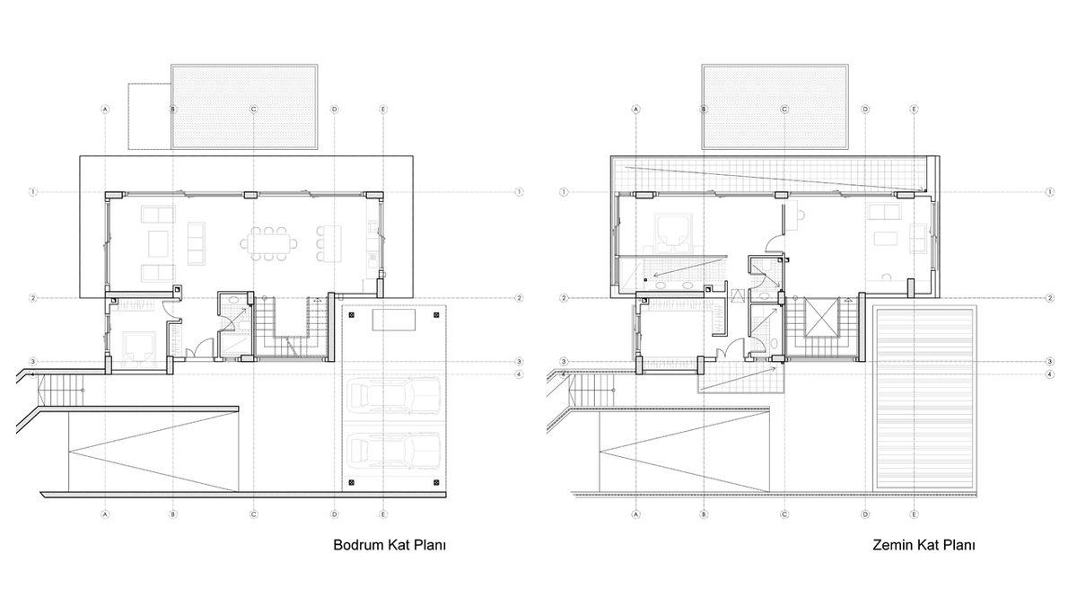 Zemin kat, yaşam alanlarının doğrudan açık alan ile ilişki kurduğu bir düzlem olarak ele alınırken; birinci kat daha kontrollü ve özel mekânları barındırır. Bu dağılım, kullanıcıların farklı mekânsal ihtiyaçlarına karşılık verir.